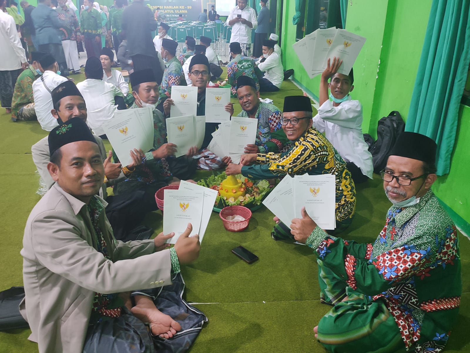 Penyerahan 37 buah sertifikat wakaf Nadzir BHPNU oleh KaKan BPN Tulungagung dan KaKan Kemenag. Tulungagung kepada Rois Syuriyah dan Ketua Tanfidziyah PCNU Tulungagung dalam puncak Harlah ke 99 NU berjalan dengan lancar.